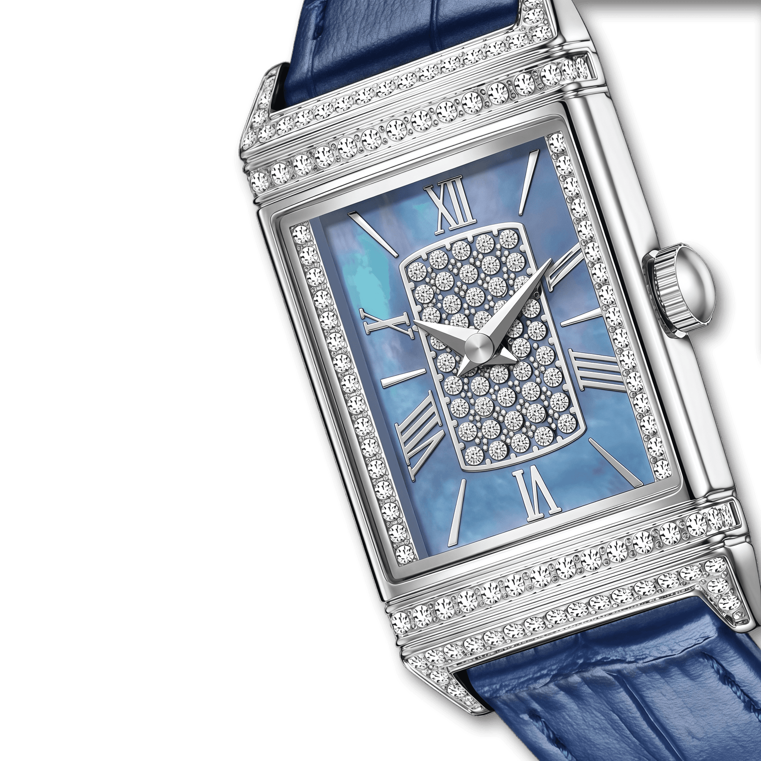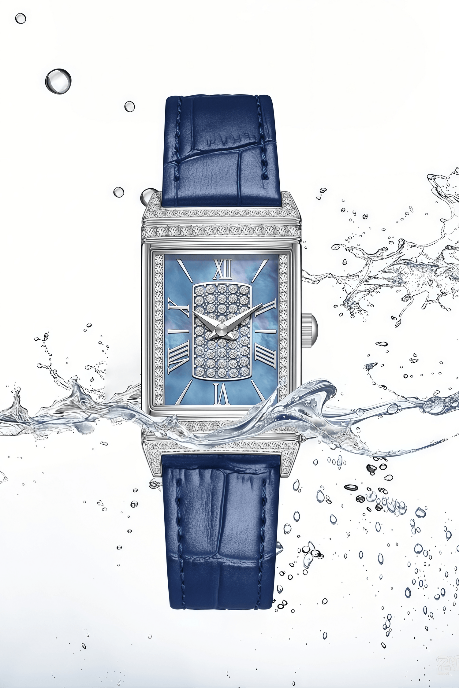 Crafted from genuine blue mother-of-pearl, each dial mirrors the tranquil waves and shifting tides, radiating a deep, luminous blue.