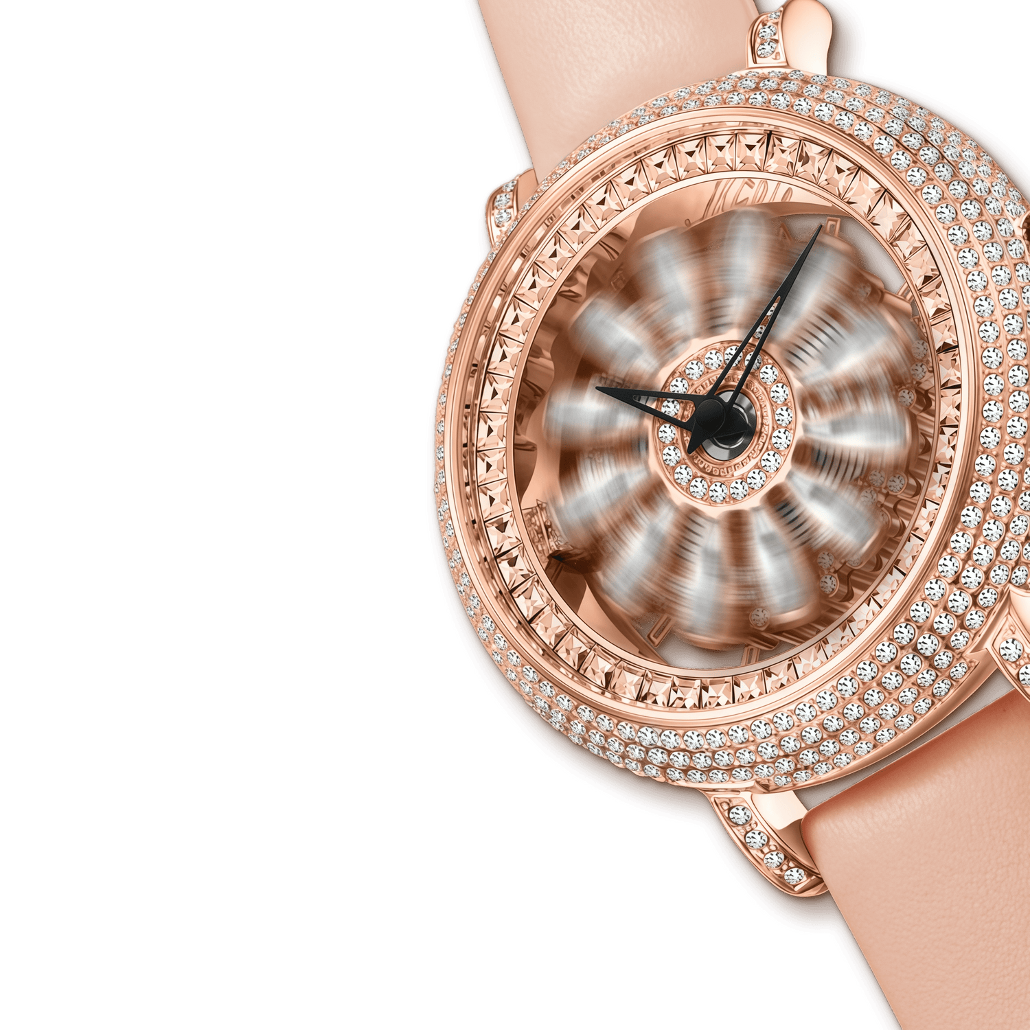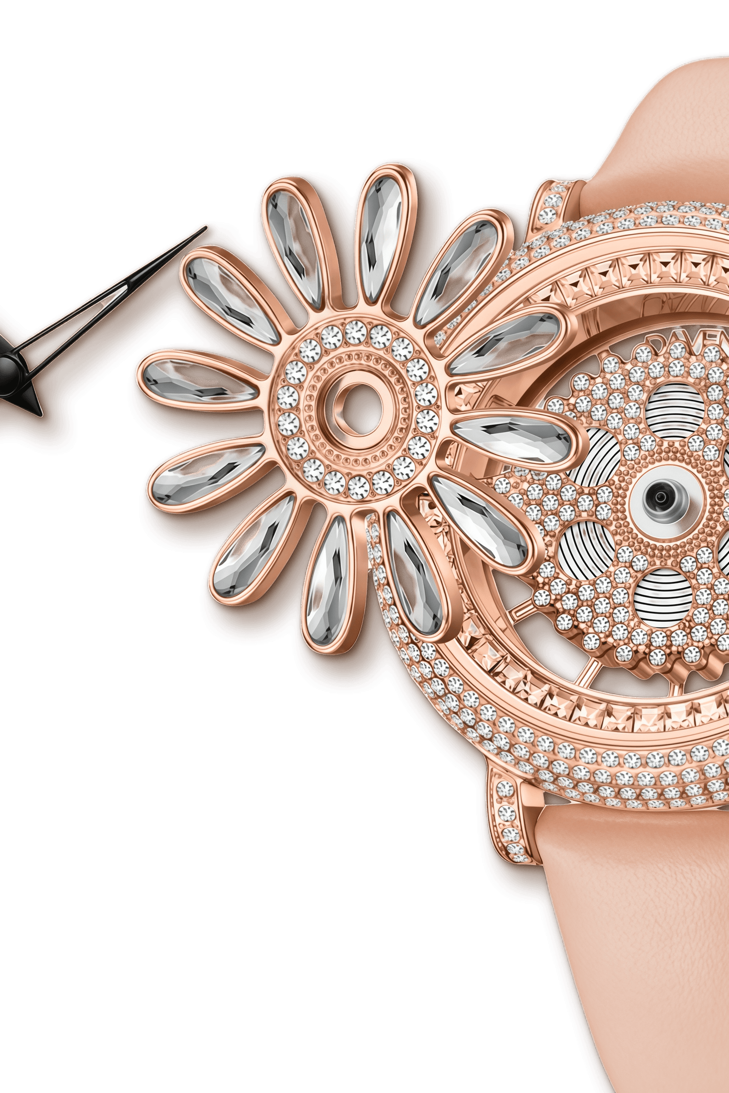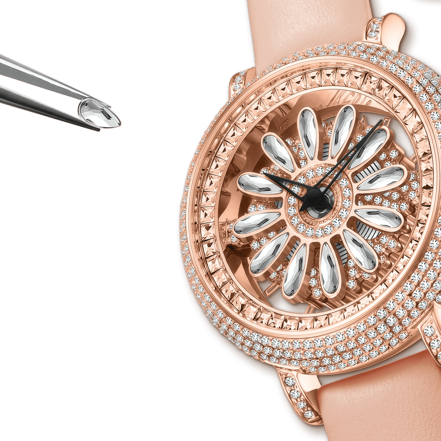 The multi-layered openwork dial reveals a floral rhythm, with petal-arranged crystals framing the see-through base.